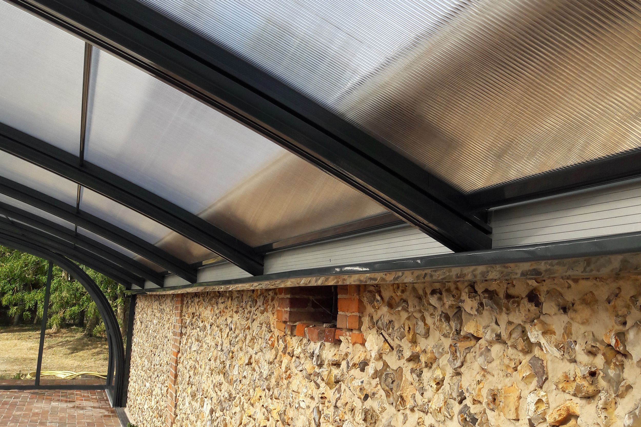 Abri adossé télescopique modèle GRAPHEN LINE entièrement transparent de dimensions 15,00 x 6,70 m sur guide encastré.