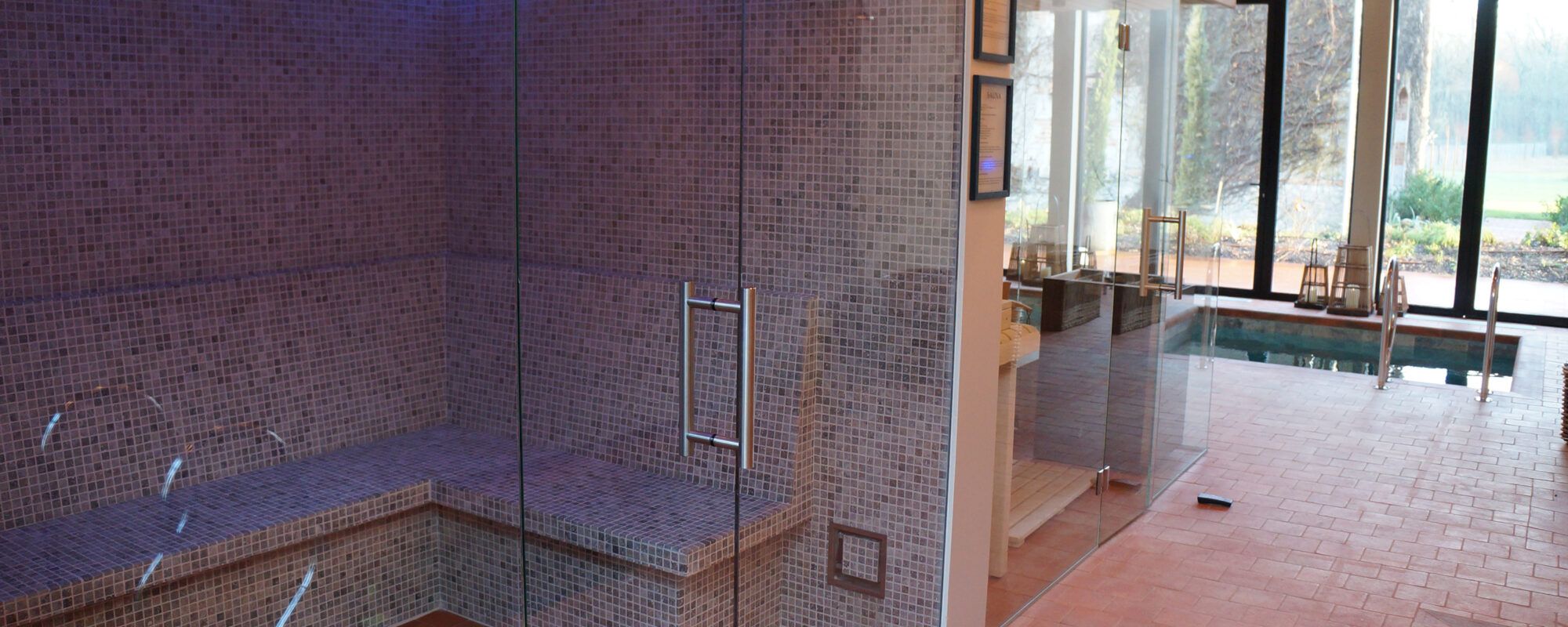 Piscine intérieure carrelée avec sauna et hammam